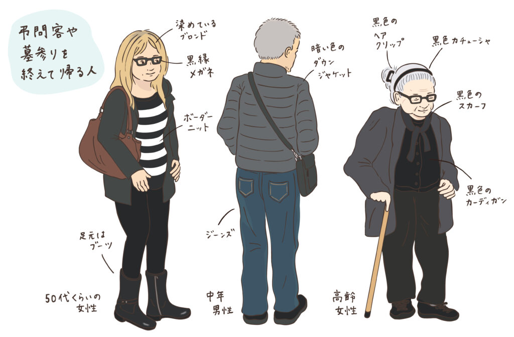 葬式もしくは墓参りを終えバス停に向かう年配の女性を見かけたが、黒色の巻物に履き物、カチューシャとヘアクリップまで黒い色でまとめられており、年代によっては黒い衣服や小物を身につけることにより意識的なのかもしれない。