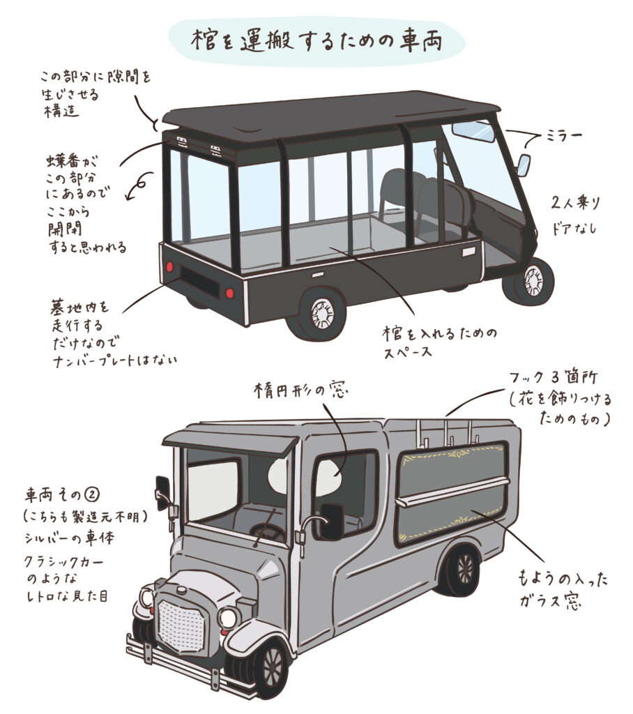 墓地を入ってすぐ左手のスペースはご遺体が運びこまれる場所なので撮影禁止となっている。棺を運び終えたからっぽの車両を見かけたのでスケッチブックに描き留めた。