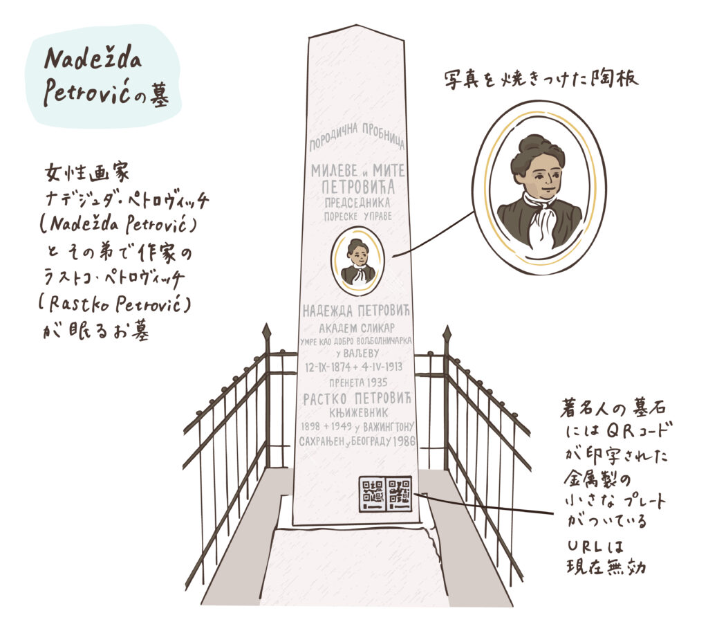 セルビアの女性画家、ナデジュダ・ペトロヴィッチ(Nadežda Petrović)の墓石をひとつ例に挙げてみたい。オベリスクと呼ばれる先端が尖った四角柱で、形自体は日本の墓石に比較的近いが、セピア調の写真陶板の下にはさまざまな情報が刻まれている。上から順に、名前、肩書き、亡くなった時の職業、没地、生没年、改葬年まで記載されていた。