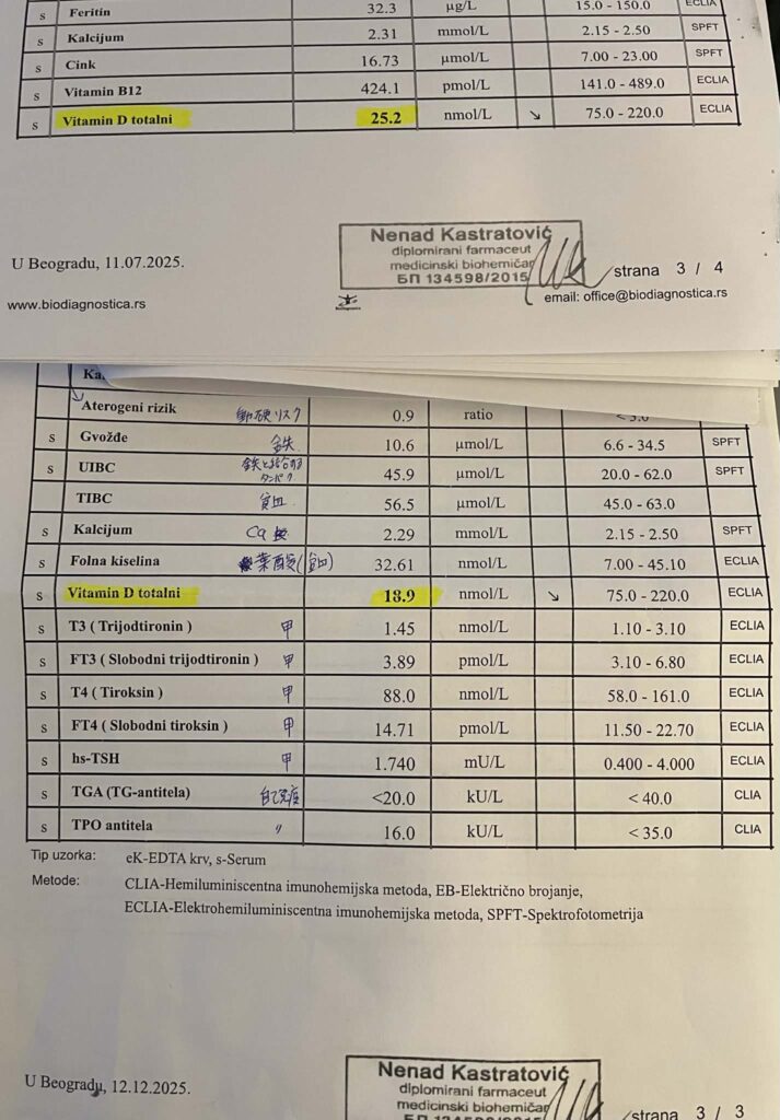セルビアと日本を比べてみると、日照時間は年間を通して同じか、ややセルビアの方が多い。しかし、セルビアは日本より緯度が高いため太陽高度(地平線に対し太陽がどれくらい高く見えるか?)が低く、日光が真上からではなく斜めから当たる。それにより光りのエネルギーが弱くなり紫外線(UVB)が地上まで届かないそうだ。実際セルビアの3月〜10月はD合成オフシーズンと呼ばれており、サプリメントで補給する人が多い。一生懸命ハイキングやマラソンの野外活動をしてもビタミンDが作りにくい環境なのである💦